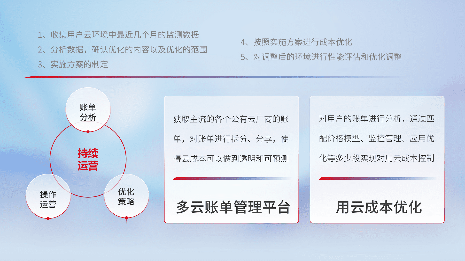 通过多云纳管,,,,以统一的资源数据模型把客户的云资源进行抽象和封装,,,进而实现对多云资源的统一操作,,保障云资源管理的可靠性、、、稳定性与可用性。。。。量身定制化运维内容,,,配置、、、开发运维、、、、补丁管理、、备份、、监控、、认证和访问管理、、、、审计和日常巡检等,,,保障在用云过程中的可靠度,,,稳定度以及高可用率。。。。